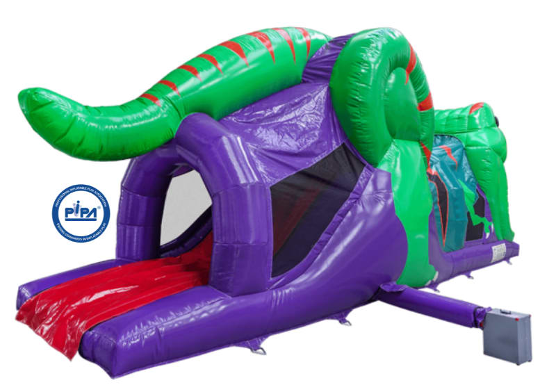 Dinosaur fans will love playing through the 35ft long assault course bouncing, past the obstacles climbing the foam steps to the top of the exit slide