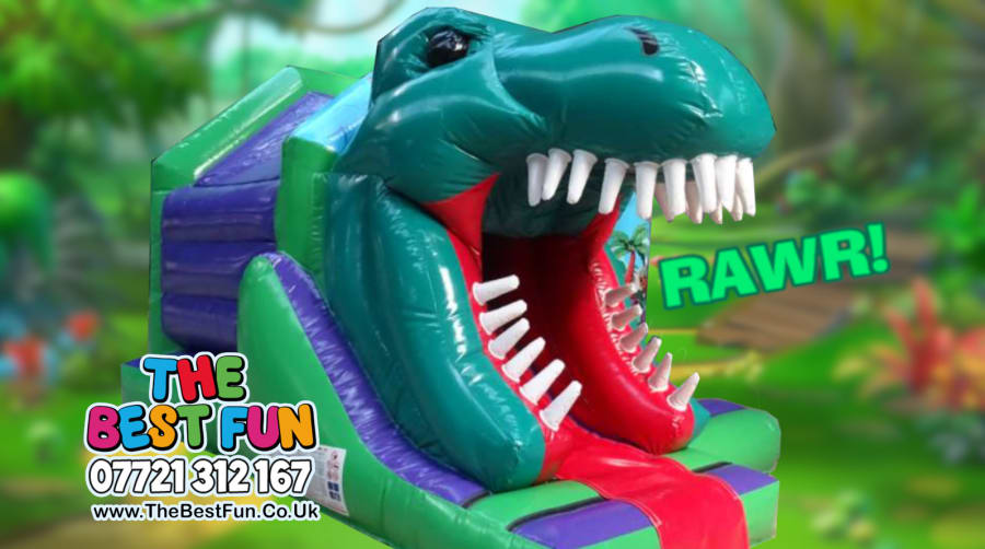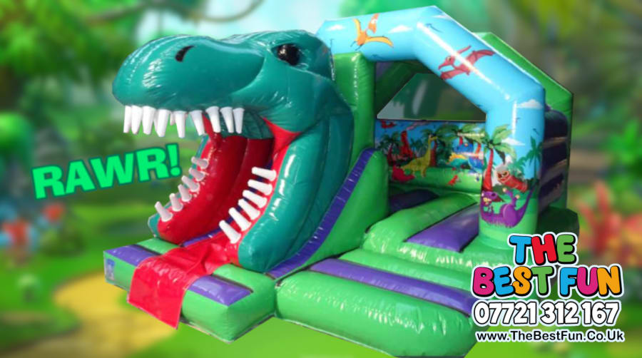 Let your children's imagination run wild! Our latest 3D Dinosaur bouncy castle with slide allows your children to bounce in the Jurassic themed area then slide through the open mouth of the T-Rex