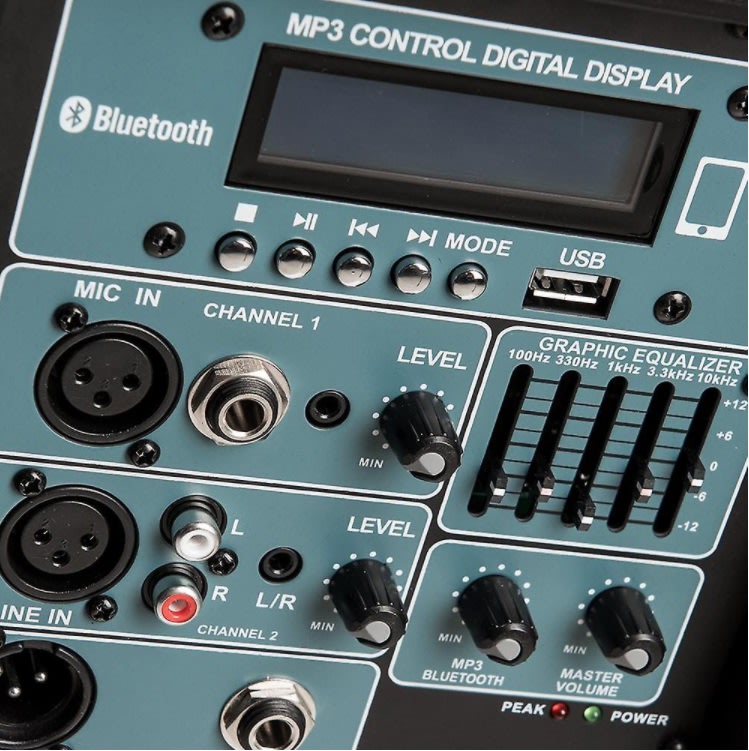 The 4 Channel mixer built so you can sing, play an instrument to a Bluetooth, USB stick, CD backing track at the same time Suitable for up to 500 people Built-in Five Band Speaker management processing Bluetooth 30m range and USB Memory Stick input Easy to carry and move as it has wheels - only 19kg Full range sound - deep bass and sweet clear high frequencies